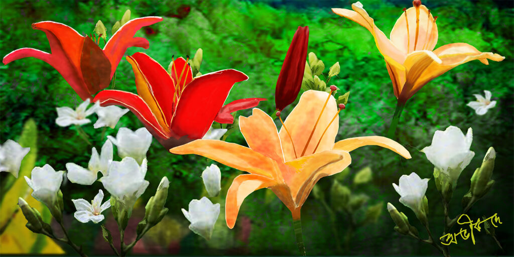 Immerse yourself in the vibrant world of “Garden’s Symphony,” a stunning digital painting by Abhik De. This captivating artwork features crimson and yellow lilies swaying gracefully against a lush green backdrop, creating a dynamic yet serene scene. Perfect for bringing a touch of floral paradise into your home, this piece is printed on high-quality canvas and available in various sizes to suit your decor needs. Whether you choose the expansive 60” x 30” size or opt for a custom dimension, “Garden’s Symphony” will transform any space with its vibrant energy and exquisite detail.