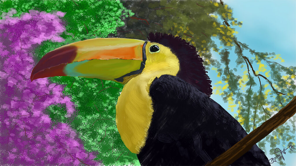 Immerse yourself in the lush beauty of the rainforest with “In the Rainforest,” a captivating digital landscape painting rendered in a vibrant oil style. This awe-inspiring artwork transports you to the heart of a thriving ecosystem. A magnificent bird, with a striking yellow beak contrasting beautifully with its sleek black plumage, takes center stage. Perched on a verdant tree branch, the bird invites the viewer deeper into the lush rainforest canopy.