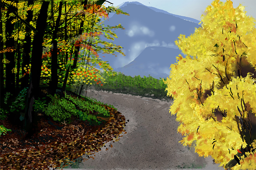 Immerse yourself in the serenity of autumn with “Fall’s Turn” by Abhik De, a captivating digital painting that brings the beauty of the season to life. Picture a winding road through a mountain landscape, lined with autumn trees displaying rich hues of yellow leaves. On one side, a colorful tree stands proudly, while the opposite side reveals sparser autumn trees, each contributing to the scene’s tranquil charm. Beyond the road, a vast valley stretches toward a distant mountain range, completing the breathtaking composition and inviting you to enjoy nature’s peaceful transformation.