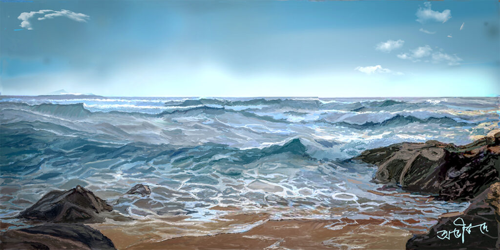 Dive into the awe-inspiring power of nature with Ocean’s Fury, a striking digital artwork by Abhik De. This captivating piece beautifully captures the raw energy and wild beauty of the ocean, showcasing dramatic waves crashing against a rugged coastline. A tiny beach in the foreground, framed by rocks on either side, provides a stunning contrast to the vast, wavy blue ocean that stretches toward the horizon.