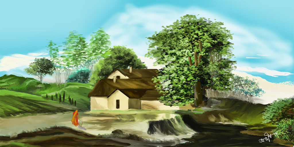 Start your day with the serene beauty of a village art masterpiece—”Morning as Usual” by Abhik De. This captivating canvas painting of landscape takes you to a charming rural village, where quaint houses with slanted roofs nestle in lush greenery. The morning sun casts long shadows across the vibrant fields, creating a peaceful scene. The gentle slope leads to a reflective pond that mirrors the hues of the sky, while towering mountains in paintings loom in the distance, completing the tranquil view. Above, a beautiful painting of nature showcases a brilliant blue sky, heralding the arrival of a perfect day.