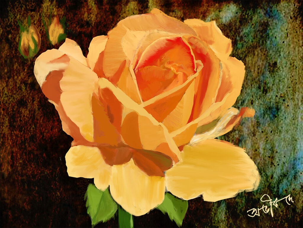 Immerse yourself in the quiet elegance of “Hushed Flames,” a captivating digital painting by Abhik De. This piece features a radiant yellow rose, its petals glowing with a soft intensity, accompanied by two tender buds and a few delicate leaves. The artwork perfectly encapsulates the serene power and beauty of nature, making it a striking centerpiece for any space seeking a touch of calm and sophistication.