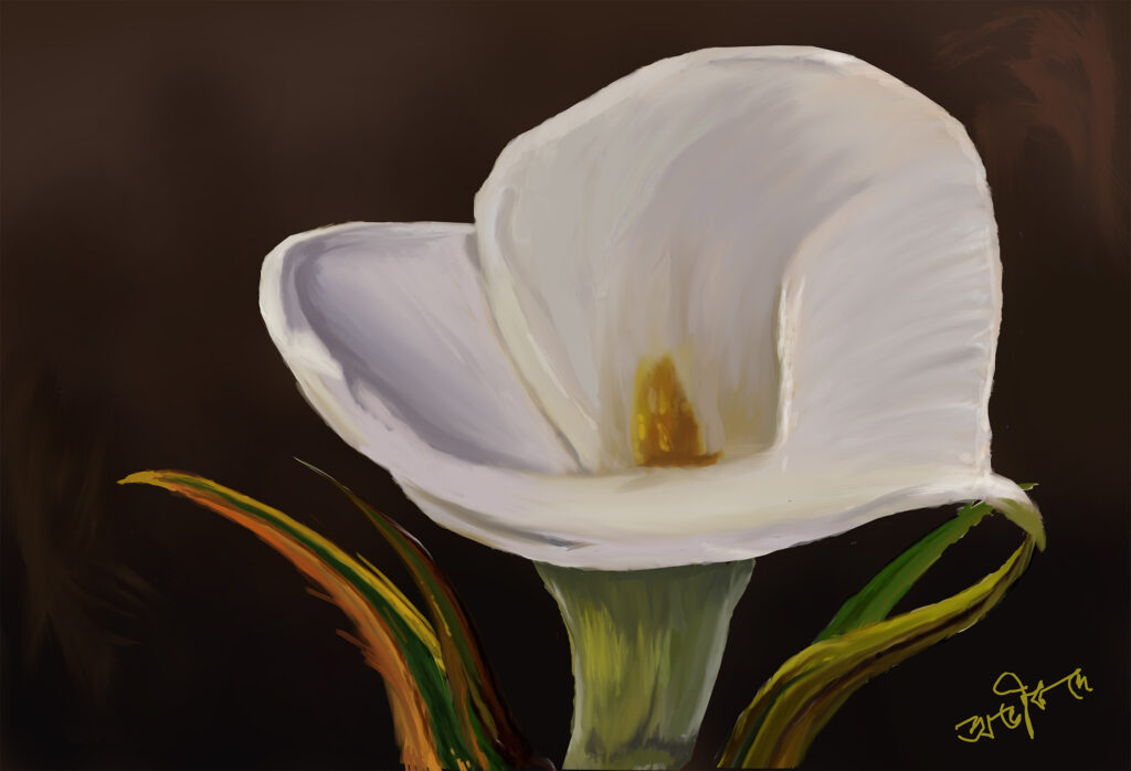 Embrace the serene beauty of “Silken Whites,” a stunning digital painting by Abhik De that invites tranquility into your space. This artwork features a single, pristine white lily gracefully emerging from a dark backdrop, illuminated by a soft, ethereal glow. The delicate petals of the lily symbolize purity, creating a striking contrast against the mystery of night, making it a captivating focal point for any room.