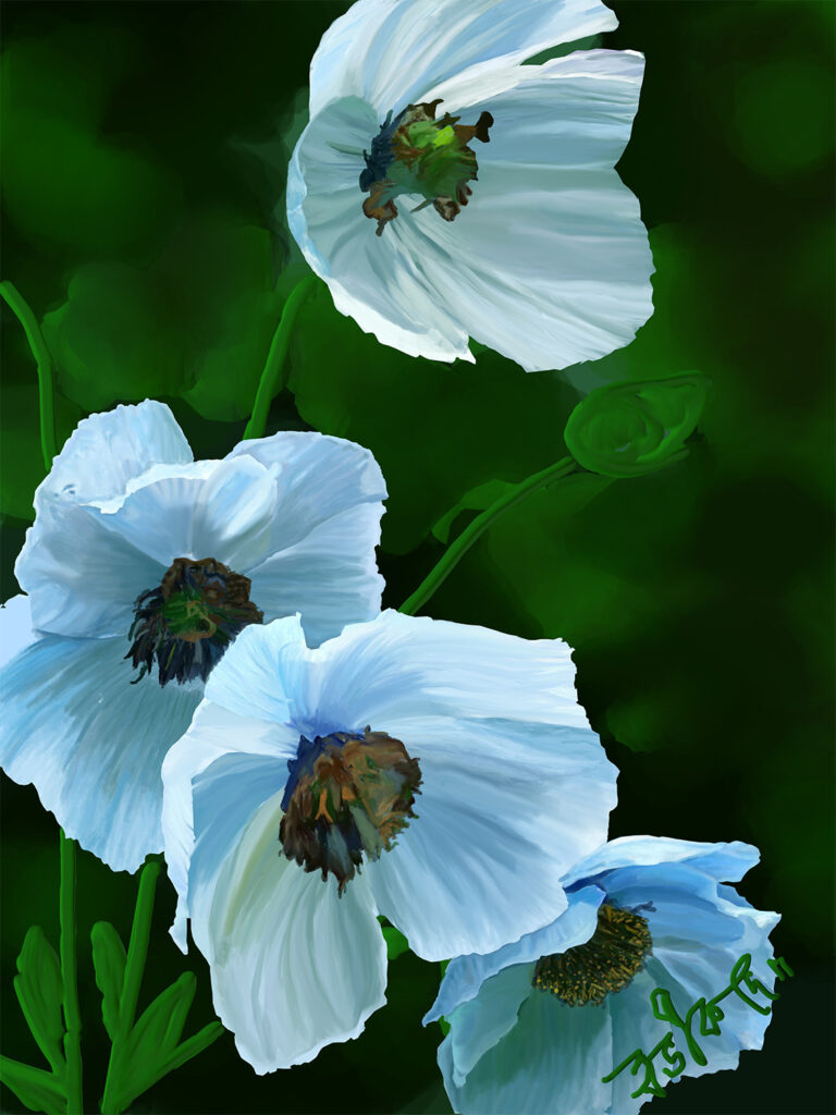 Embrace the serene elegance of “Pale Innocence” by Abhik De, a mesmerizing digital painting that captures four delicate sky-blue poppies set against a dark green background. The contrast between the cool blue petals and the deep green field evokes a sense of tranquility and depth. This captivating floral piece brings the beauty of nature into your home, making it a perfect addition to any living room, bedroom, or creative space. With its soft, soothing tones, “Pale Innocence” creates a calming atmosphere while adding a touch of modern art to your decor.