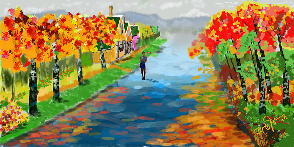 Take a peaceful stroll through a breathtaking autumn road painting with “Alone in Autumn” by Abhik De. This captivating digital artwork invites you to lose yourself in a tranquil fall-season landscape painting. A wide, serene metal road winds through a mesmerizing scene adorned with vibrant autumn leaves art. On both sides of the road, towering autumn trees artwork burst with fiery reds and golden yellows, their shimmering foliage a spectacle to behold. The scattered red and yellow leaves painting creates a carpet of nature’s finest hues, evoking feelings of solitude, reflection, and wonder.